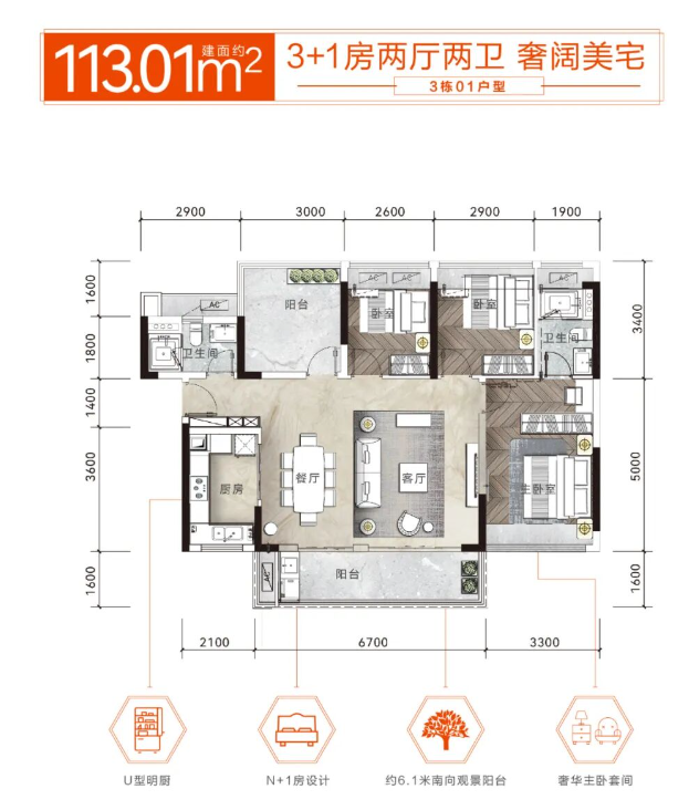 这一户型着重于空间的拓展性与实用性。3+1房的设计,意味着在标准的三个卧室之外,还有一个可灵活改造的空间,可作为书房、儿童房,甚至储物间,极大地增加了空间的利用率。宽敞的客厅与餐厅相连,形成LDK(Living, Dining, Kitchen)一体化空间,增加了家庭成员的互动性和空间的通透感。约6.1米长的南向景观阳台,为室内引入充足的阳光,也提供了绝佳的观景平台。主卧室套房设计,增加了私密性,并配备独立的卫浴,提升了居住的便捷度。此户型适合有成长性需求的家庭,能够满足多人居住的需求。