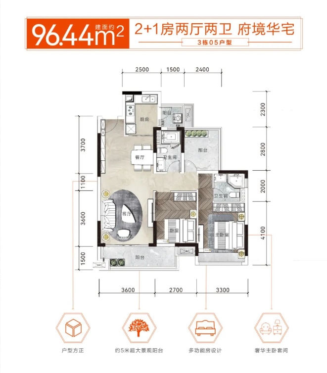 此户型在面积上更为紧凑,但通过精巧的设计,依然提供了舒适的居住体验。2+1房的设计,同样具备了灵活改造的空间,可以根据家庭成员的变化进行调整。约5米的超大景观阳台,是该户型的一大亮点,它不仅拓展了室内空间,也为居者提供了亲近自然的场所。多功能的设计,体现在了各个空间区域的合理布局上。客餐厅区域宽敞明亮,动线流畅。主卧室套房的设计,保证了私密性和舒适性。该户型适合核心家庭,在有限的空间内实现了功能与品质的兼顾。