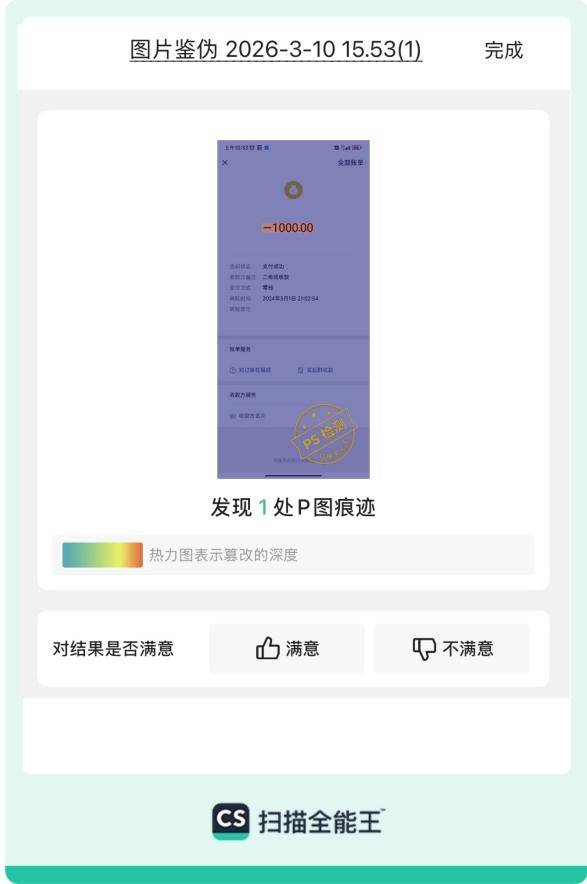 图说:扫描全能王“图片鉴伪”功能识别并标出支付页面截图PS篡改痕迹
