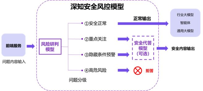 该对话风控模型主要由风险研判模型和安全代答模型构成。其中,风险研判模型负责完成对输入的风险识别与分类,实现风险的主动发现、实时预警。安全代答模型则负责对识别出的重点关注类和隐藏条件预警类问题进行回应,按照“事实澄清-政策引用-正向引导”的三段式原则进行回应,兼顾风险防控与服务体验。对于部分存在安全风险的提问,模型并非简单拒答,而是根据风险研判结果,灵活触发安全代答模式或拦截机制。当启动安全代答模式时,模型将依托权威文件构建的动态更新知识库提供回应,回复内容均可溯源至官方权威文件。