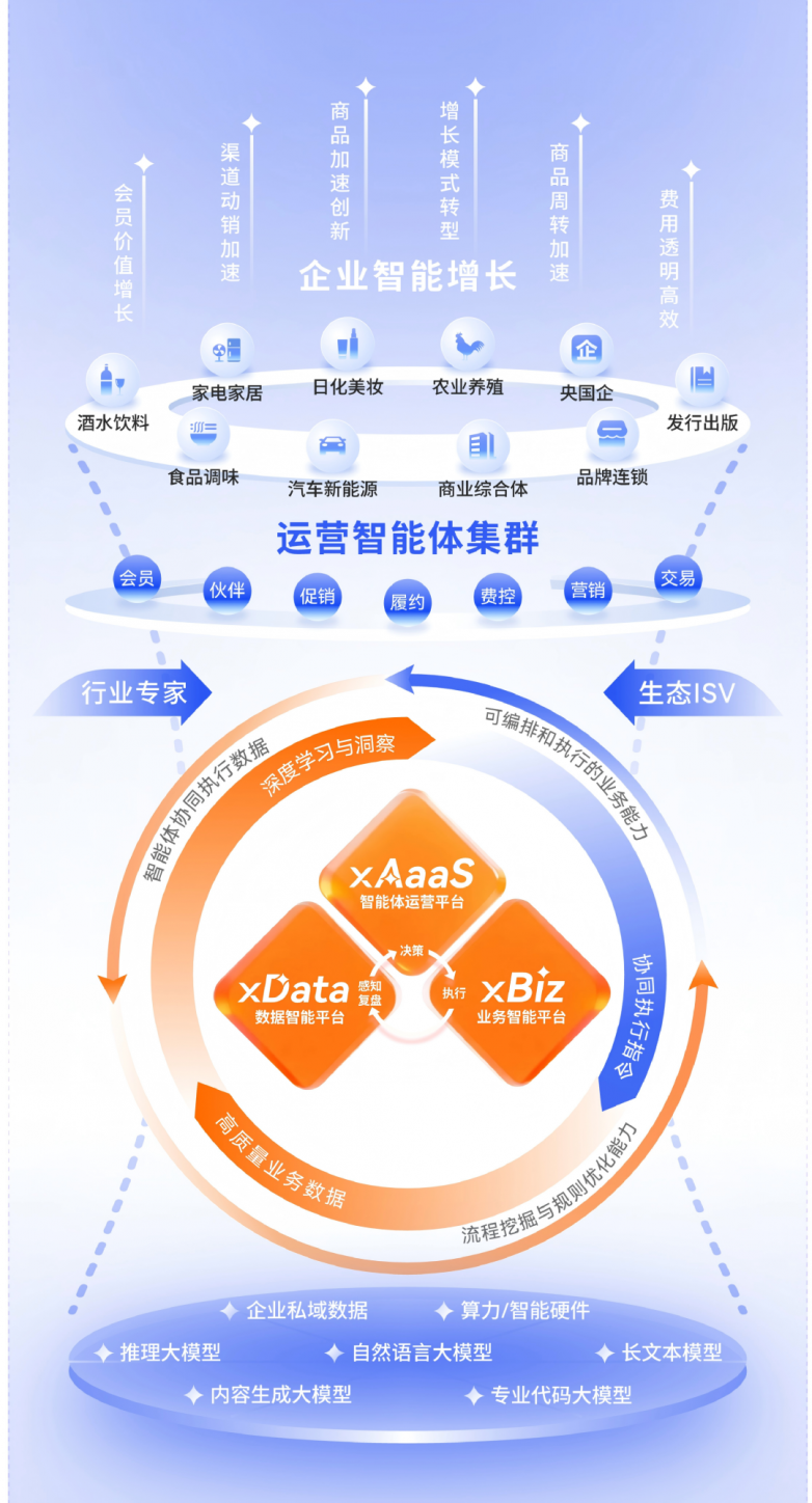 云徙科技xGOS.AI企业运营超级智能体,它的目标不是提供一个更强大的单点工具,而是为企业交付一个可自主或半自主驱动业务的“数智运营团队”,即承载AI作为“业务主体”的新型运营基座。