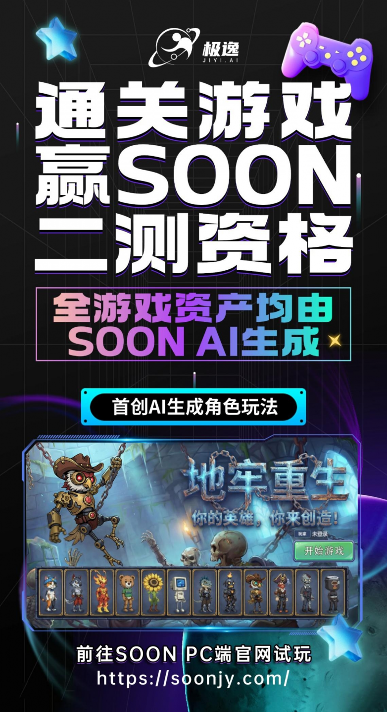 依托极逸人工智能多年游戏研发经验与AI技术沉淀,AI游戏创作平台SOON已构建从素材生成、数值调试到逻辑搭建的全流程AI开发体系,能够支撑不同类型高品质游戏的快速落地。随着越来越多玩家通过《地牢重生》体验到真正的AI游戏品质,SOON平台将进一步推动AI技术在游戏创作中的深度应用,为全球玩家带来更具创意与沉浸感的数字娱乐体验。