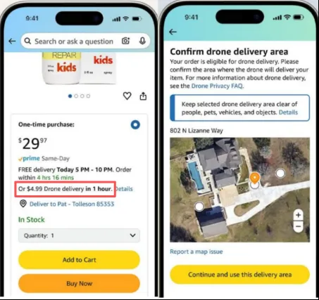这一款新型无人机,是亚马逊在2024年11月才投入商用的“MK30 ”。它基于最新的电子地图和AI技术,无需事前实地勘测,也无需识别地面二维码,便可以精准投放包裹,其适用的配送场景,远远超出了以往“需要识别地面二维码”的旧式无人机。