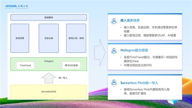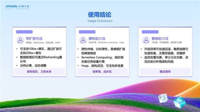 使用了阿里云Hologres+Flink这套技术栈以后,我觉得我们既有现在又有未来。如刚才所说,现在能支持理想汽车一百多万辆车的一个场景,也可以通过扩容去支持未来200万辆车甚至更多的一个场景,不需要做多种集群的拆分。第二方面是效率高,成本低。Hologres具有极致的弹性能力,还有一些这种Serverless Computing这样的弹性资源,大幅提高我们的资源利用率,避免资源浪费。而且Hologres是一个多模态的分析场景,未来还可以扩展到OLAP分析、点查服务、全文检索、向量搜索以及AI推理等多种场景。