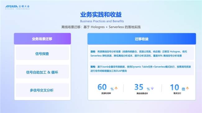 整体资源的利用率比原先离线的能提高60%,成本是离线场景能下降到35%,下降了35%,整体的这个交付的时间基本上从原来的3到5天能减少到4个小时之内,覆盖了90%离线信号分析场景。