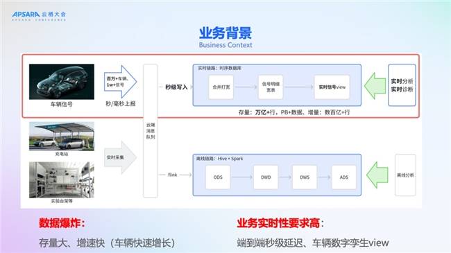随着电动车和智能汽车的快速普及,车联网信号数据呈现爆发式增长。理想汽车作为国内领先的智能电动汽车企业,已拥有超过100万辆在网车辆,每辆车每秒上报多达上万个信号(如车速、胎压、温度、电池状态等),整体数据规模达到万亿级别。这些数据不仅体量巨大,而且对实时性要求极高——端到端延迟需控制在2秒以内,至少不超过5秒,以支撑数字孪生、智能诊断、车辆预警等关键业务场景。