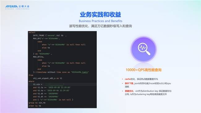 在查询层面,我们是做到了1万+QPS的秒级返回。主要是基于Hologres的cache优化能力,保证热点数据能覆盖到95%以上。基于条件下推减少了scan的扫描,jsonb列存化减少scan时的io大小和cpu消耗。然后针对这一些大量的点查,vin作为distribution key 保证数据均匀分布, ts作为clustering key帮助高效裁剪文件。