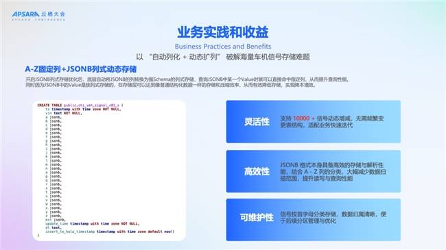 - 高效性:JSONB格式具备高效存储与解析性能,结合A-Z列分类,大幅减少数据扫描范围;