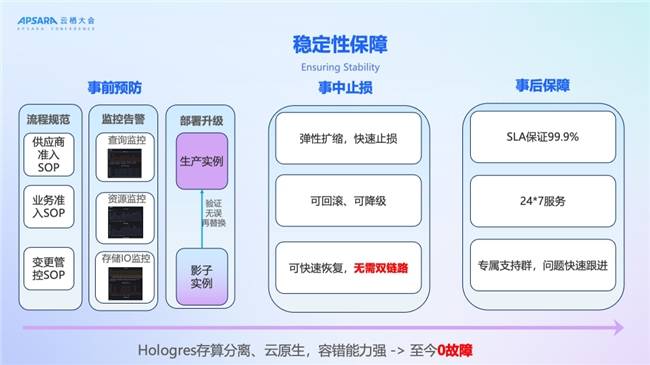 稳定性不仅是产品的能力,更是流程机制的建立。理想汽车基于Hologres 存算分离、云原生架构,系统容错能力强,上线至今0故障,同时在内部构建了“事前预防、事中止损、事后保障”的全链路稳定性体系:
