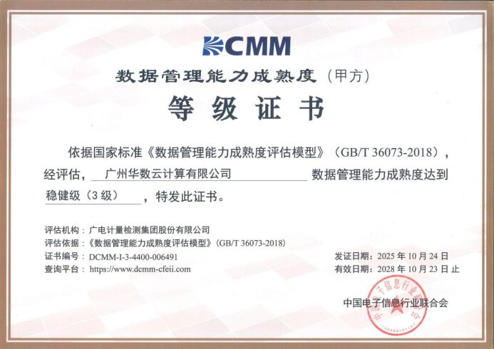 根据国家《数据管理能力成熟度评估模型》(DCMM)评估结果,华数云已达到三级(稳健级)水平:在数据战略、治理、安全与应用等方面建立了体系化的管理机制,实现关键数据在组织内的规范整合与有效利用。