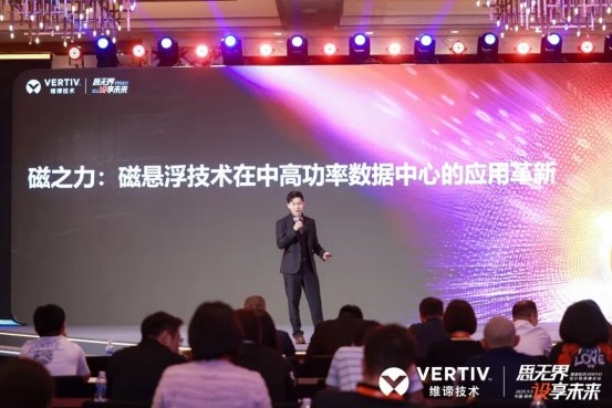 在本次峰会上,维谛技术(Vertiv)中国区热管理解决方案部高级产品经理贾晨昱先生重磅发布了维谛技术最新的数据中心制冷创新成果——磁悬浮技术方案,为行业提供了新的解题思路。维谛技术本次峰会上推出了两套磁悬浮技术方案,分别是磁悬浮冷冻水系统和磁悬浮多联风冷系统。磁悬浮冷冻水系统主要应用于大型机房,可满足500-4000柜中高功率服务器整机柜制冷需求,兼容性极佳,可兼容风冷,液冷,同时节能效率更高,可显著降低机房能耗,并且寿命高达25年。磁悬浮多联风冷系统主要应用在中小型机房,满足200-3000中高功率服务器整机柜制冷需求,应用部署灵活,可兼容0-45kw的风冷散热需求,同时集成了磁悬浮,氟泵等节能技术,制冷上更高效,并且是无油运行,维护更方便。
